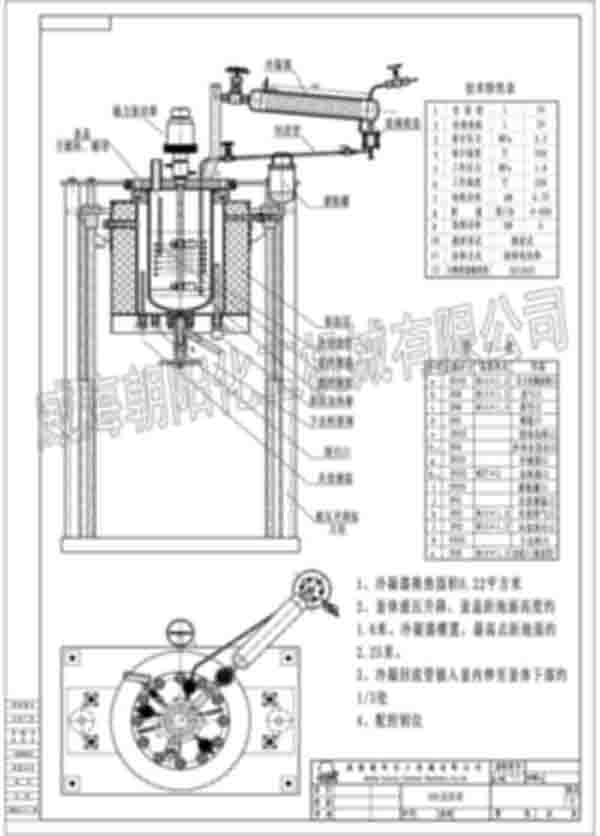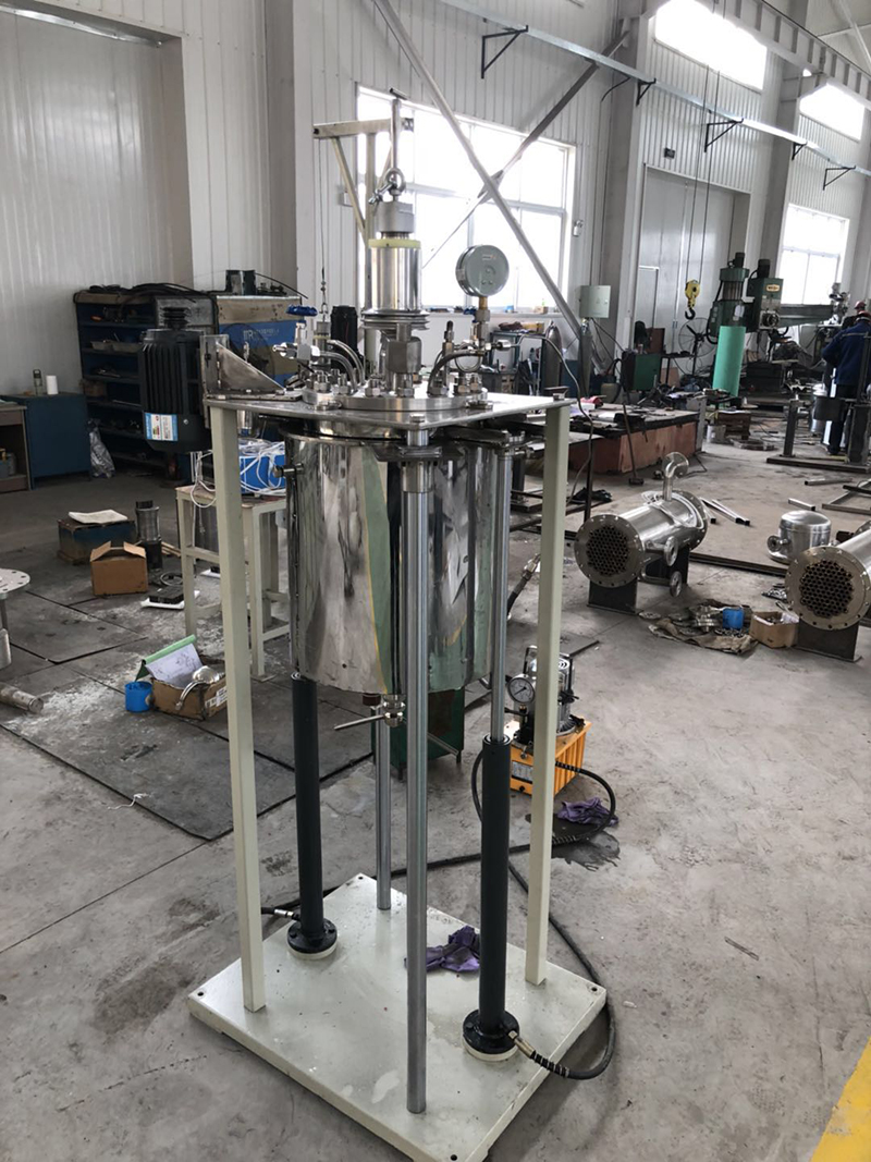 我公司為江蘇地區(qū)客戶制作的20L反應(yīng)釜。設(shè)備采用磁力驅(qū)動攪拌器配推進式攪拌槳葉,攪拌轉(zhuǎn)速為500r/min。反應(yīng)釜設(shè)計溫度達240℃,設(shè)計壓力為2.2MPa。制造材質(zhì)為不銹鋼S31603。該設(shè)備配備了冷凝回流裝置。釜內(nèi)配備冷卻水盤管。此設(shè)備釜蓋為框架固定,釜體配電動液壓裝置升降。